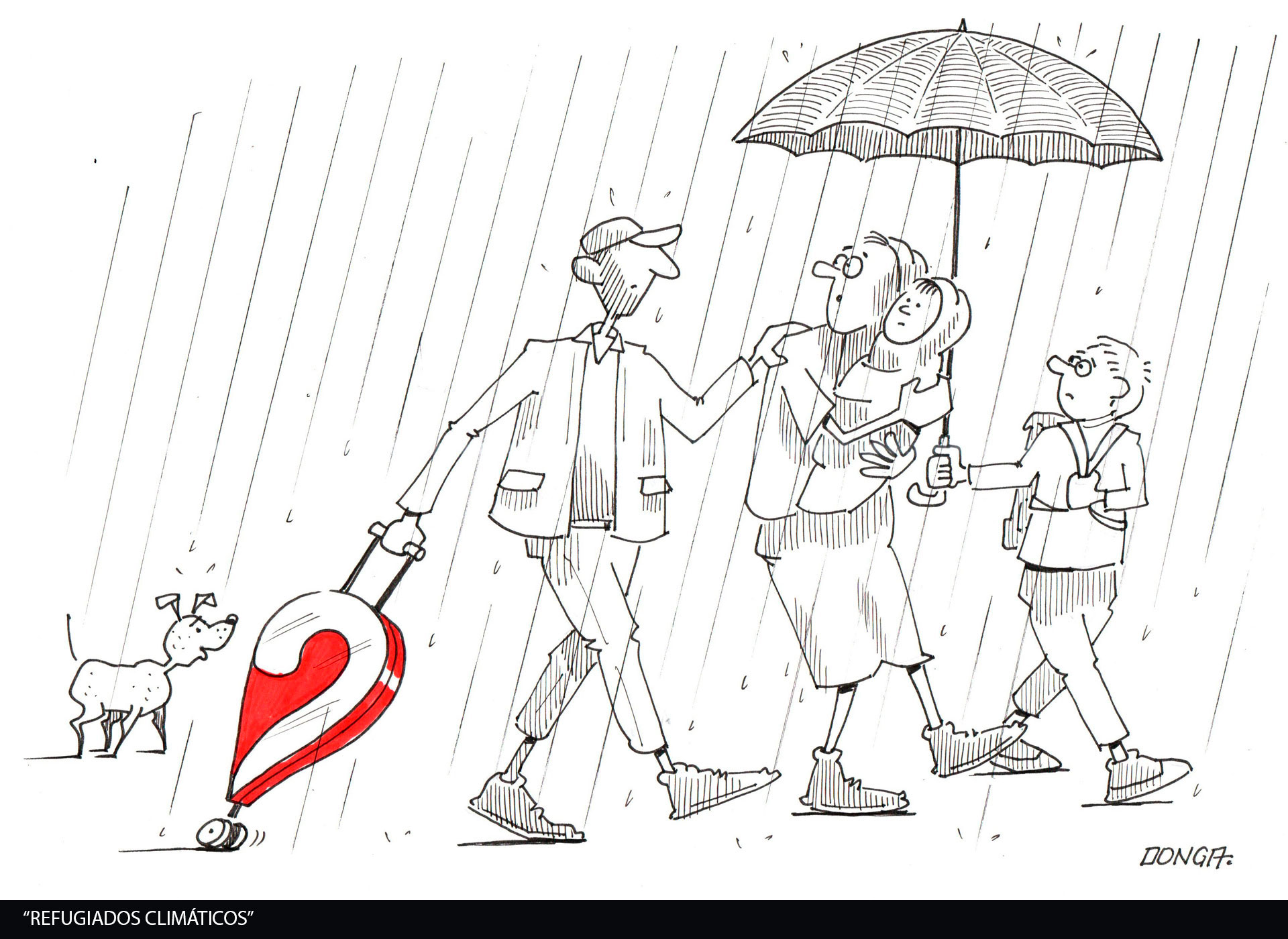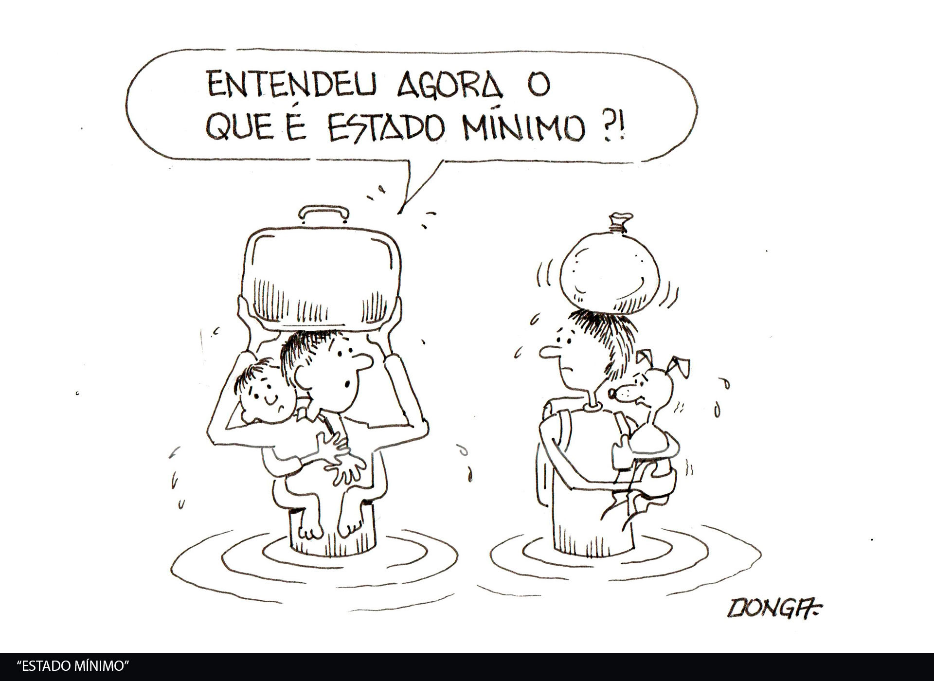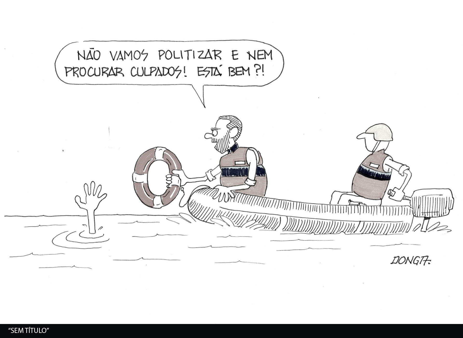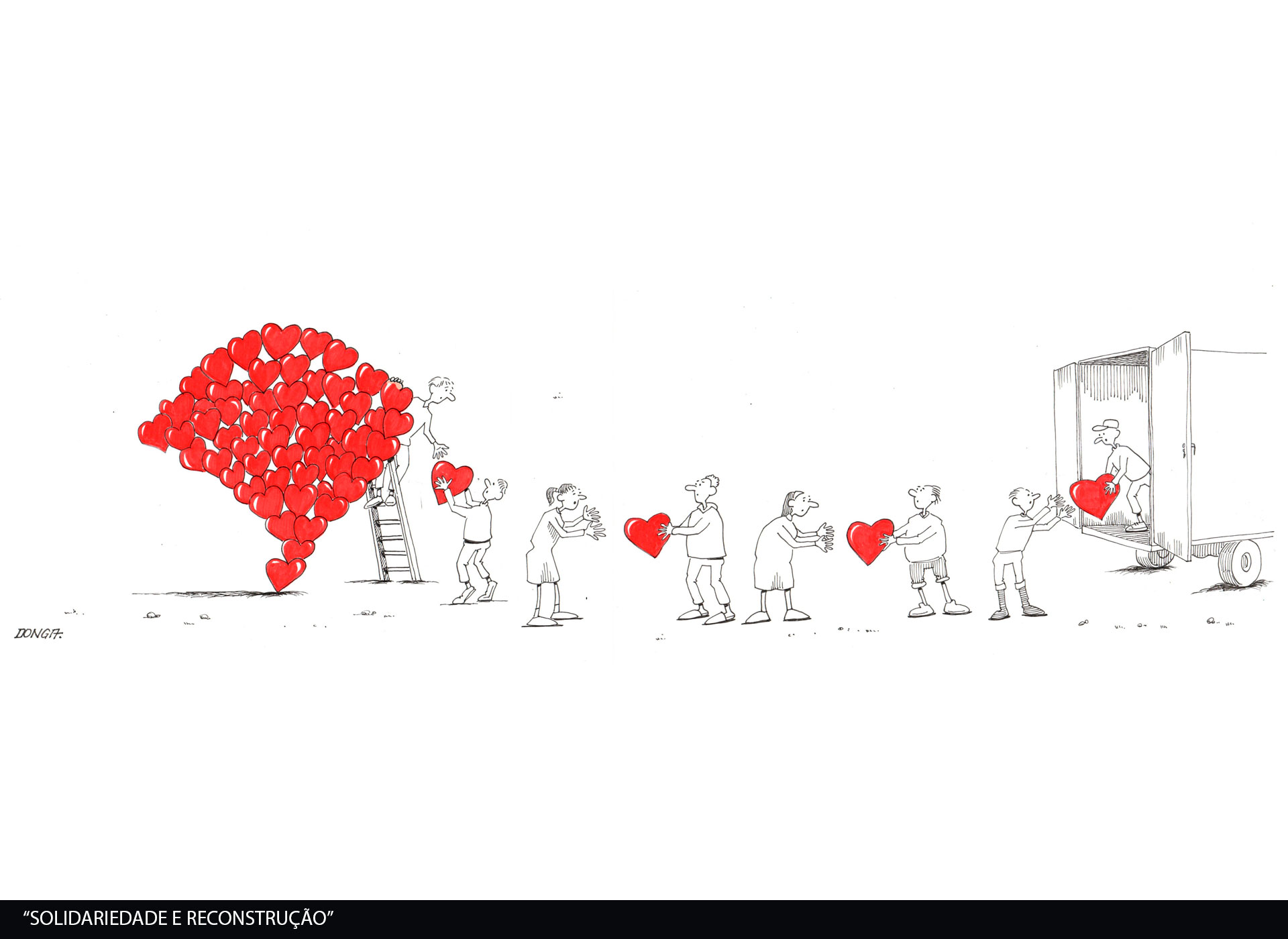 Por meio de seu traço característico, Donga evidencia as múltiplas dimensões deste acontecimento: o agravamento das crises climáticas e seus efeitos sobre os grupos mais vulneráveis, a negligência do poder público na prevenção e no enfrentamento do desastre, bem como as profundas consequências humanas, econômicas e ambientais.